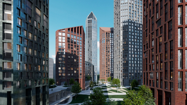 Скорее оно выглядит как результат нового поиска. Да и надо заметить, что ничего традиционного, никакого укрупненного повторения исторической застройки, – здесь не ощущается. Заострения асимметричные, высокие, башни как будто лихо «обрубили» в верхней части. Это оригинально, а не консервативно. Весь силуэт приобретает контур, сходный не с обычной московской «кучкой башен», а с Сити, причем не обязательно московским. Сити, как известно, отличает стремление каждой доминанты из собранных так плотно, что им сложно переспорить друг друга и доминировать, к особенному силуэту. В данном случае, впрочем, – не совсем так: башни поменьше, высоты разные, да и заострения при всем разнообразии ракурсов объединены одним приемом. Но типология силуэта – именно такая.