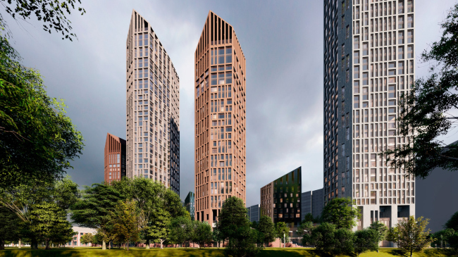 Цвет фасадов – напротив, скорее попадает в московский тренд последних лет, любви к кирпичу естественным коричневатым, серым и зеленоватым оттенкам. В не меньшей степени он созвучен недавней работе «Студии 44» в Петербурге – жилому комплексу на территории Мытного двора; только там сдержанно-изумрудная зелень – керамика, а тут алюминий, композит или фибробетон. Оттенки позволяют различать дома, но общность сдержанной гаммы придает жилой части цельность и отличие от контрастных зданий бизнес-центра и школы.