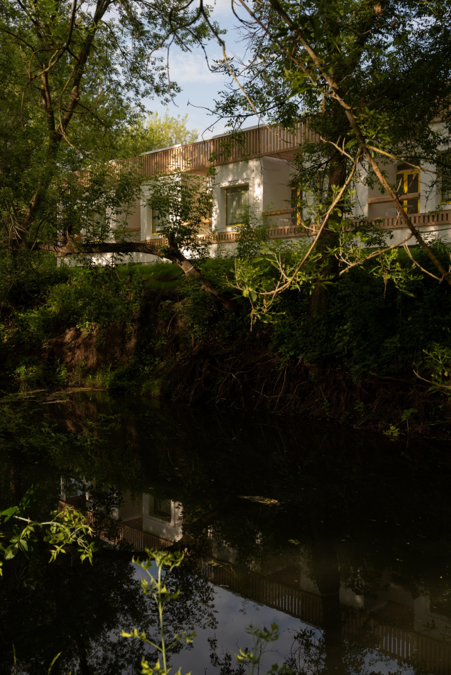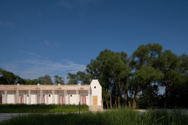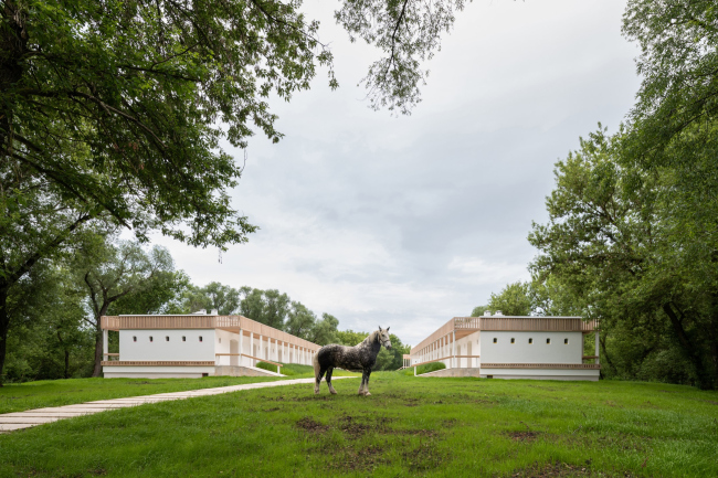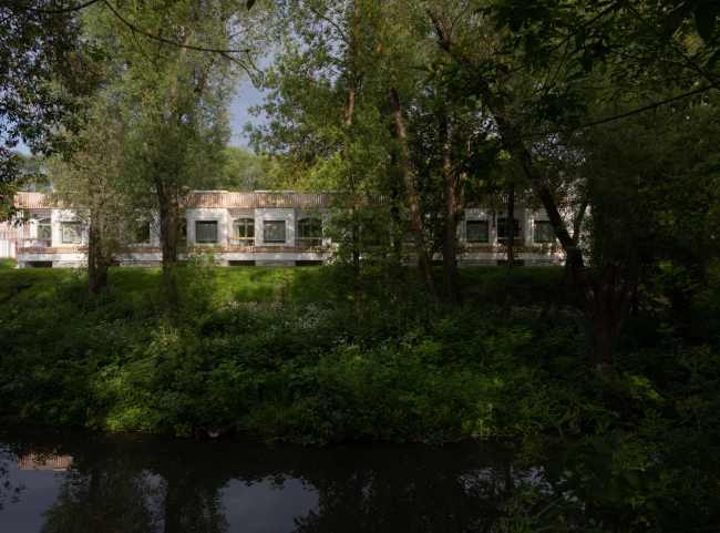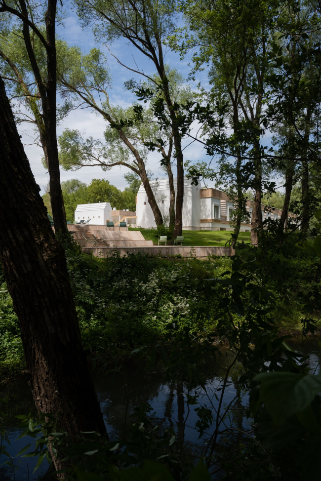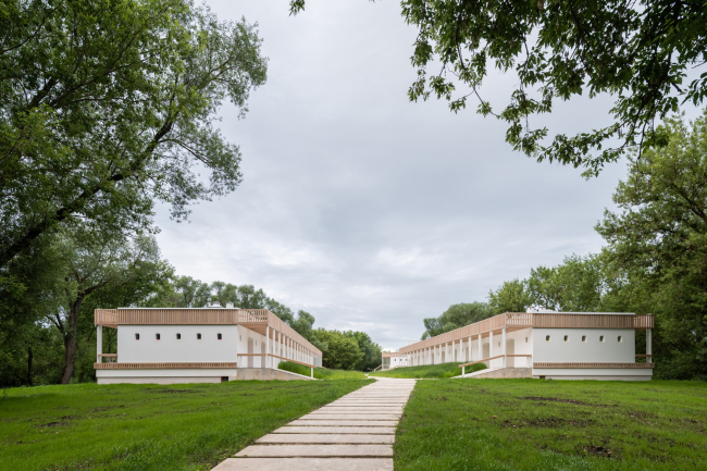 Место для гостиницы выбрали уютное и обособленное: на полуострове, образованном крутым изгибом речки Каменки, берега которой густо поросли деревьями. Архитекторы расположили на нем три одноэтажных корпуса на 8, 9 и 12 блокированных номеров. В навигации гостям помогает небольшое различие в цвете: рамы и дверные полотна в каждом корпусе имеют свой оттенок – травы, одуванчика или кипрея.