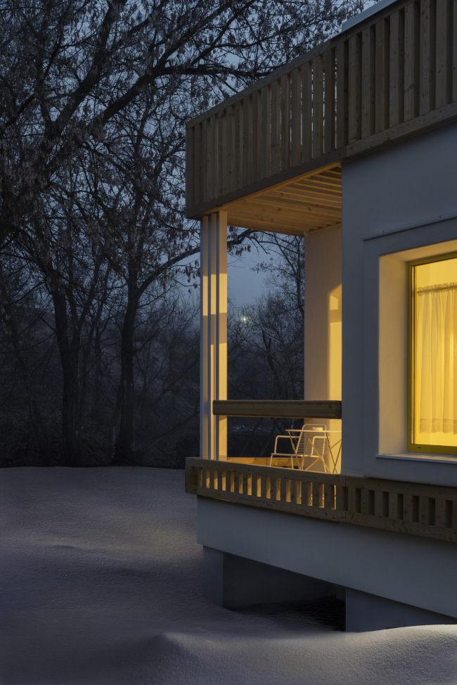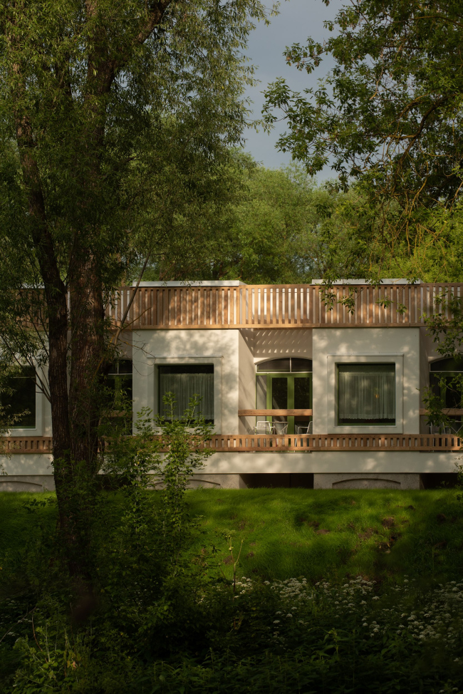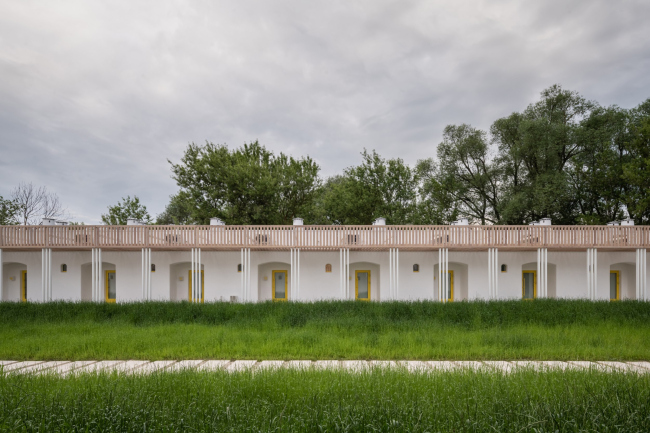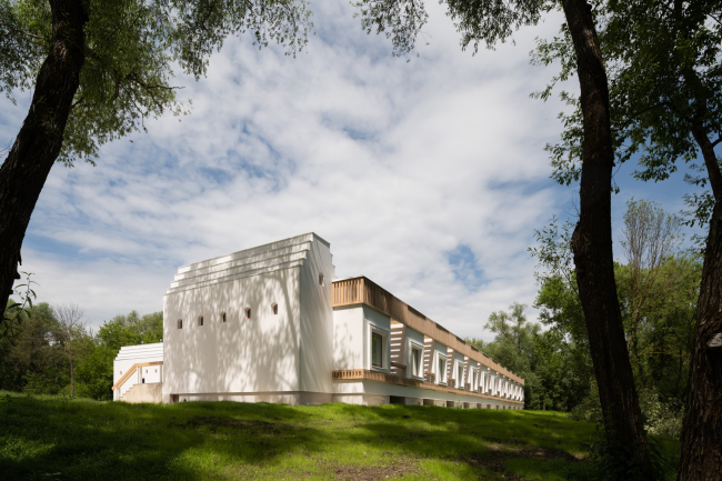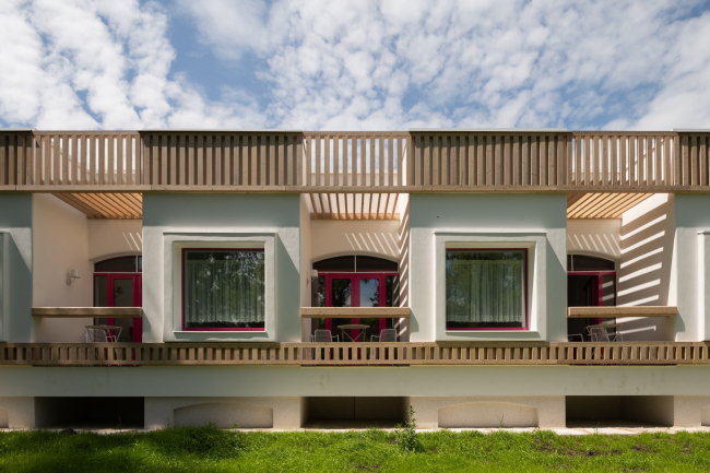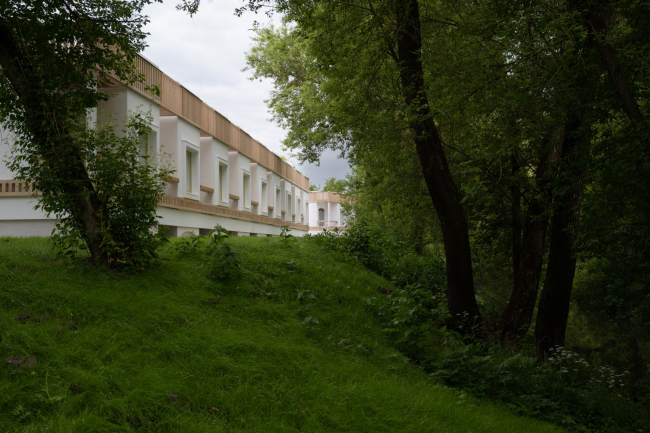 Номера же обращены окнами и укромными лоджиями к берегу реки. С этой стороны цоколь наоборот оставили открытым, из-за чего объемы кажутся приподнятыми над ландшафтом. Главным декоративным элементом стали карнизы из деревянных реек, поддержанные балками перил и перголами на лоджиях. Как и со стороны двора, при боковом освещении они дают красивые графичные тени, навевающие что-то средиземноморское. Еще один «микс», довольно ироничный, – большие окна без импостов, затянутые кружевной занавесочкой.
