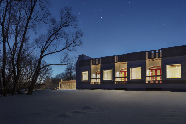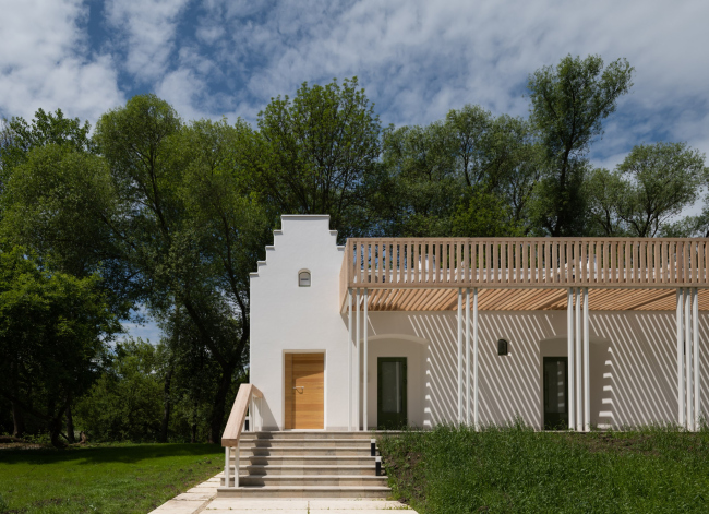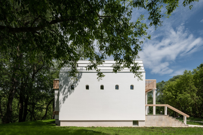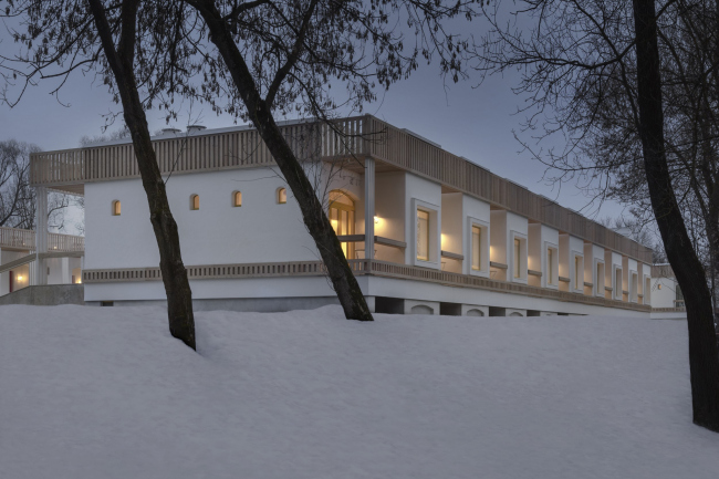 Тем не менее, ощущение от постройки как снаружи, так и внутри – именно русское. Толща стен с маленькими оконцами и глубокими нишами, «гульбище» деревянной галереи, живая «мазаная» поверхность, полуарки, утопленные в траву стены – это все родное и очень красивое. Образ получился настолько собирательным, что с одного ракурса здание напомнит о храме и кротости монастырской жизни, с другого – об усадебной конюшне, гостином дворе или дачной веранде.