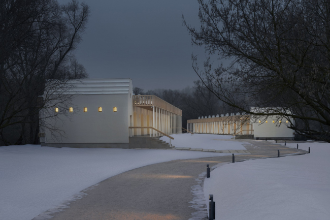 В этом проекте Megabudka продолжила эксперименты с поиском идентичности русской архитектуры, но от деревянного зодчества перешла к белокаменному. Как и в случае с Центром гостеприимства, среди оказались не только русские постройки: Ростовский кремль и торговые ряды уездных городов соседствуют с и деревенскими домиками сербской глубинки. Объемы технических блоков без сомнения напоминают печь, но и в не меньшей степени – ганзейский торговый домик. Похожие перекрещивания мы находили и в предыдущей работе бюро.