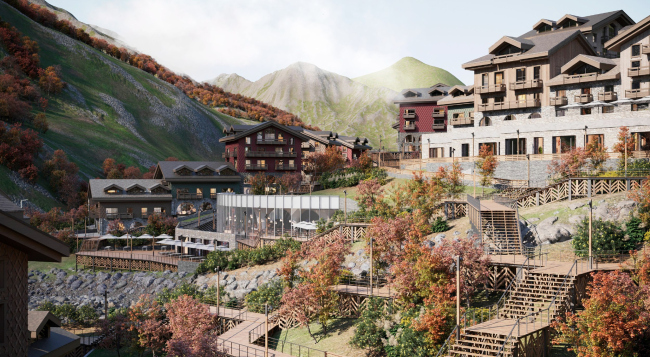 Объекты интереса соединит сеть пешеходных маршрутов, проложенная в пределах горных деревень, а также экотропы. Чтобы привлечь гостей в теплое время года и сформировать универсальный всесезонный курорт, предлагается развивать инфраструктуру для альпинизма, катания на лошадях и велосипедах, в том числе горных, а также строить семейные парки активного отдыха.