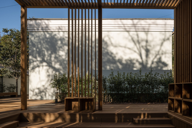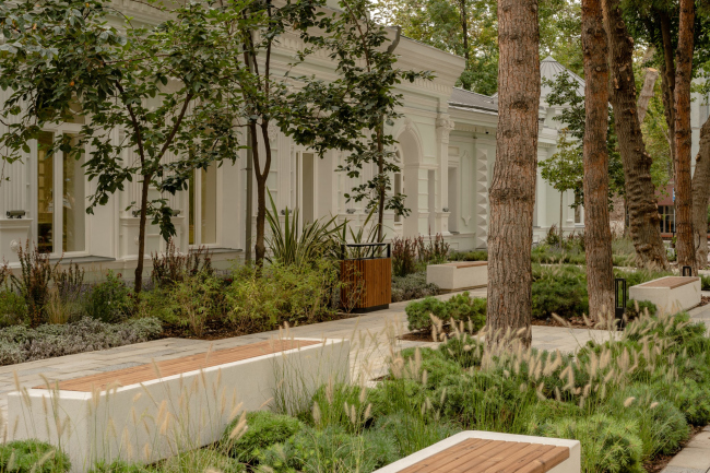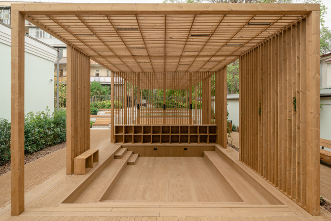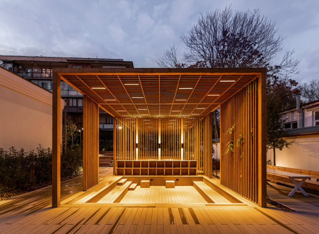 Во дворе есть небольшая сцена с амфитеатром, который органично вписывается в существующий рельеф: там проводят спектакли, лекции и другие образовательно активности.