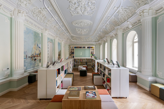 Республиканская детская библиотека ТашкентаФотография © Денис Комаров / предоставлена Ludi ArchitectsРеспубликанская детская библиотека ТашкентаФотография © Денис Комаров / предоставлена Ludi Architects Особенностью обновленной библиотеки стали открытость и гибкость сценариев ее использования. На смену изолированным книжным залам пришли светлые, проницаемые, связанные друг с другом пространства. Закрытые хранилища преимущественно сменила свободная выкладка книг на стеллажах. Большой зал с исторической лепниной стал многофункциональным: теперь здесь можно читать лекции, проводить кинопоказы и мастер-классы. На первом этаже библиотеки расположились рабочие зоны, зал для собраний, камерные тихие коворкинги и музыкальный класс.