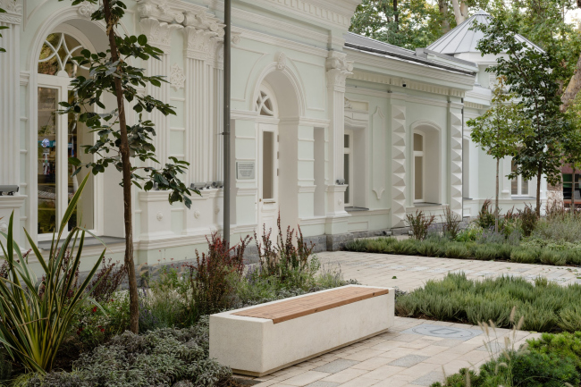 В проекте реконструкции использован комплексный подход: команда бюро занималась реновацией здания, его интерьерами и благоустройством прилегающей территории. При работе с объектом культурного наследия было важно учесть множественные ограничения и рамки, заданные историческим зданием. Архитекторы «вплетали» функции и сценарии использования библиотеки в уже сложившийся объект, грамотно балансируя между «классическим» и современным.