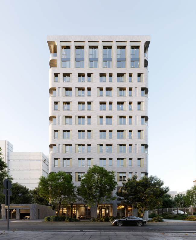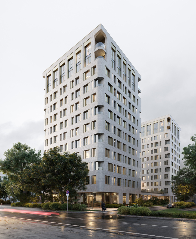 Архитектура «башен» и выбранные для фасада материалы одновременно откликаются на контекст и привносят в него новые веяния. Первый этаж с входными группами и коммерческими помещениями отделен от основной массы дома за счет отступа и галереи. Этажи со второго по десятый – типовые, но на нечетных в угловых квартирах имеется открытая лоджия. Этот простой прием чередования помог акцентировать углы, поскольку именно на них приходится самое большое количество неостекленной поверхности – «массы», которая фиксирует границы здания. Со стороны улиц углы скруглены, что создает ощущение мощного стержня – композиционного и структурного – на который нанизаны все элементы дома.
