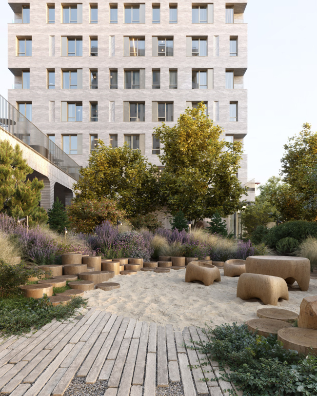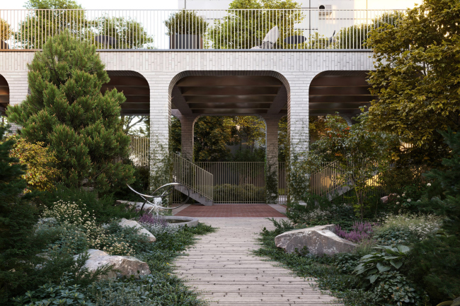 Под «балконом» – парадная «гостиная», которая встречает жителей по возвращении домой и настраивает их на спокойный ритм. Это пространство обращено во внутренний сад. Кирпичные опоры и балки, никельная «подшивка» и скругленные порталы напоминают утратившую инфраструктурное значение эстакаду, которую постепенно «захватывают» растения – что-то вроде нью-йоркского парка Хай-Лайн. Такая аллюзия, связанная с технологическим прогрессом, хорошо ложится на выбранное в архитектуре направление ар-деко.
