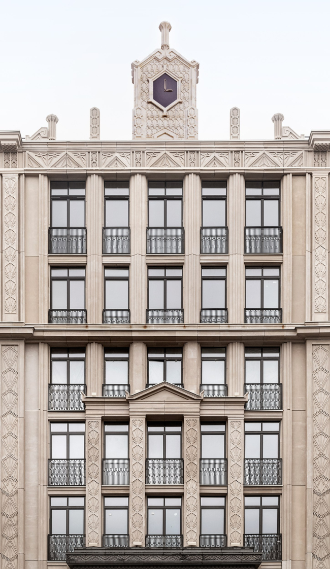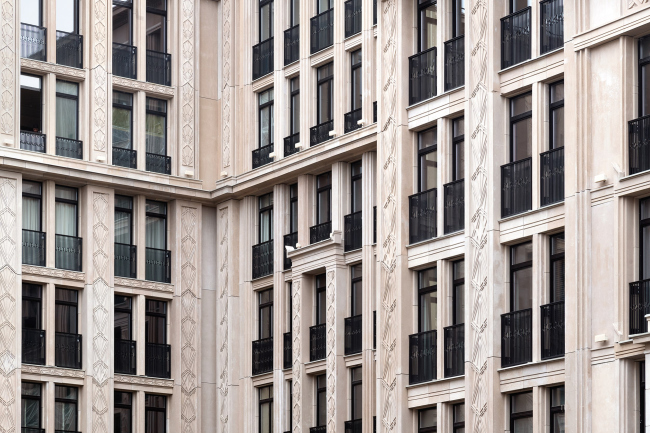 Жилой комплекс «Маленькая Франция»Фотография © Алексей Народицкий / предоствлена Липгарт АрхитектсЖилой комплекс «Маленькая Франция»Фотография © Алексей Народицкий / предоствлена Липгарт Архитектс Тем не менее дом отличается. Почему-то его назвали «Маленькая Франция». Во Франции тоже многое можно найти, но по ощущениям предложенное решение – скорее британское. Декоративность, плоскостный рисунок филенок, но особенно вертикальные детали над карнизом, похожие на пинакли и на орнаментированные трубы, которых так много в английских замках XVI – XVII веков. А, больше всего, – миниатюрная башенка с часами на оси курдорнера. Все они напоминают о стиле, сложившемся в Британии периода Якова Стюарта, затем с энтузиазмом воспринятом в Северной Америке, где его не без успеха пронесли до ар-деко включительно.