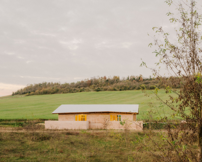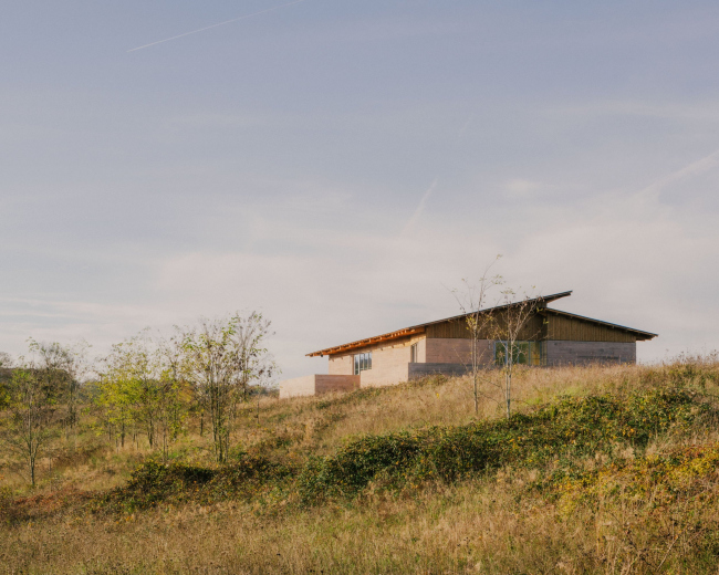 Внешний облик постройки общей площадью всего 400 м2 кажется простым и ясным. По признанию авторов, он соединяет в себе элементы архитектуры, которую они называют «придорожной», и привычного для сельской местности амбара. Нижняя часть выполнена из светлого фактурного бетона, поверхности которого имитируют деревянную отделку.