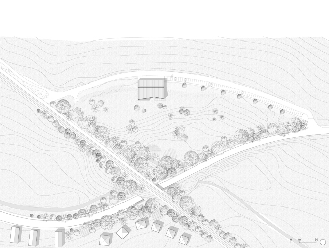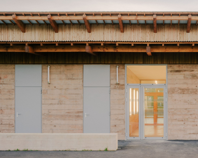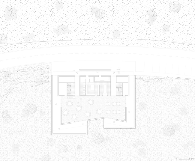 Массивное, укорененное в земле основание формирует также террасу вокруг основного объема. Верхняя часть здания выполнена из золотистого дерева. Двускатная кровля, крытая металлом, довольно низка и лишена привычного конька, так как обе ее асимметричные части имеют разную высоту. Учитывая немного кокетливый угол нижней кромки одного из скатов, то на первый взгляд вполне предсказуемый объем, сохраняя демонстративную скромность, однозначно заявляет о своем непростом характере и важной функции.