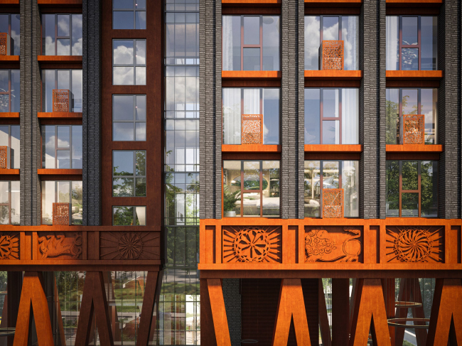 Его архитекторы, отчасти в шутку, называют триглифно-метопным: через паузы «триглифов», чьи оси совпадают с осями фасадных пилонов, размещены «метопы» с изображениями из прорезного кортена. Темы заимствованы из деревянной резьбы домов Нижегородской губернии, в частности Городца, их авторы подобрали в Владимира Горячева о городецкой резьбе. А надо сказать, что, так как оба города – поволжские, то в них долго сохранялась рельефная резьба, воспринятая еще в начале XVIII века от кораблей петровского и последующего флота. Как и мотивы. На самом деле мифологическое, хотя на вид сказочные.