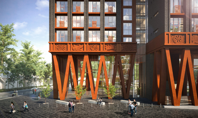 Тем не менее кирпич – фон, а главный герой тут – кортен. Из него сделаны межэтажные тяги, им же облицованы и круглые колонны внутри, и зигзаг колонн внешнего контура.
