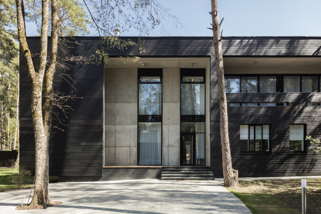 Один из первых современных российских примеров масштабного применения архитектурного бетона в архитектуре частного загородного дома. Идею использовать именно этот материал заказчику предложил автор проекта – архитектор Борис Уборевич-Боровский, который признается, что давно мечтал поработать именно с бетоном. «Это материал, который во многом и превратил XX век в эпоху ярких архитектурных достижений, и, конечно, хотелось продолжить эту традицию и добиться того высокого качества поверхности, которое мы знаем по реализациям в Швейцарии или, скажем, Японии», – признается автор проекта. И отмечает, что заказчик сразу же охотно поддержал идею реализовать большую часть фасадов дома из архитектурного бетона. В том числе и потому, что изначально делал ставку на подчеркнуто современную стилистику своего загородного дома. Композиционно перед нами фактически параллелепипед, в каждой грани которого архитектор делает глубокие ниши, за счет чего у дома возникают просторные террасы, удобные балконы, торжественное по своему масштабу крыльцо главного входа. Бетонные поверхности – это как стены всех ниш, тогда как в роли самого внешнего слоя, помогающего идеально интегрировать жилой объем в природный ландшафт, выступает дерево, выкрашенное в черный цвет.