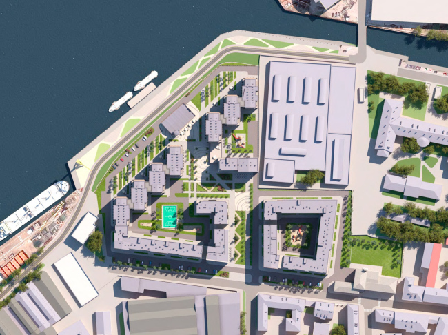 Выбранная композиция формирует три группы домов с приватными дворами. Также появляется зигзагообразный променад, ведущий к Неве. Улицы Перевозная и Александра Блока не продлеваются до набережных. Под «пятнами» застройки будут организованы подземные паркинги, первые этажи займут встроенные коммерческие помещения.
