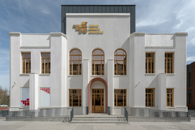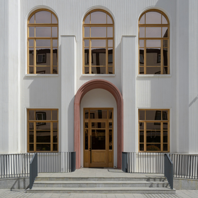 Теперь объем 1930-х годов легко считывается благодаря белому штукатурному покрытию, которое архитекторы актуализировали с помощью каннелюр. Габариты и раскладку оконных и дверных проемов сохранили. Окна с двойными деревянными рамами с фрамугами выполнены в дубе для большей художественной выразительности. В оригинале, вероятнее всего, это были сосновые окрашенные окна, но они не сохранились.