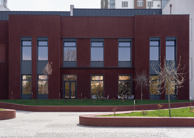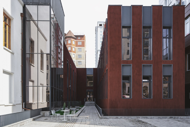 Бордовая штукатурка помогает определить пристройки 1990-х годов и новый объем со стороны внутреннего двора, в котором разместились технические и административные службы театра. Выбранные авторами цвета помогают зданию вписаться и в окружающий контекст – в соседних жилых домах используется примерно та же гамма.