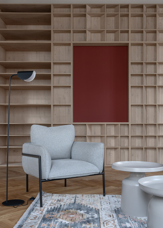 Театр юного зрителяФотография © Вячеслав Вазюля / предоставлена Alexey Podkidyshev studioТеатр юного зрителяФотография © Вячеслав Вазюля / предоставлена Alexey Podkidyshev studioТеатр юного зрителяФотография © Вячеслав Вазюля / предоставлена Alexey Podkidyshev studioТеатр юного зрителяФотография © Вячеслав Вазюля / предоставлена Alexey Podkidyshev studio Вдоль одной сложной стены архитекторам было необходимо организовать библиотеку с лючками ревизии и несколькими нишами для демонстрации актуальных афиш и спектаклей театра. Для этого использовали сдвоенные стойки и сбитый модуль полок с разной глубиной от компании egger.