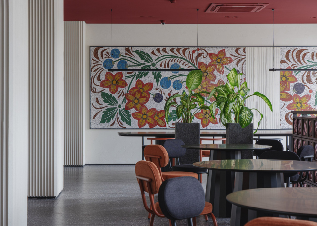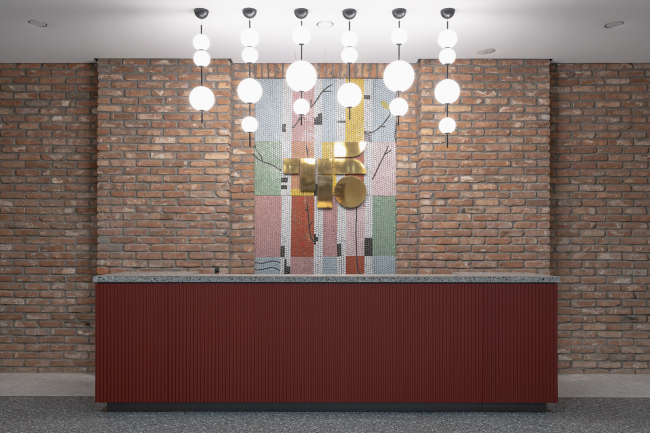 Также украшением интерьеров стали два мозаичных панно. Одно размещается у входа – абстрактные деревья, второе в кафе – цветы. Панно не театральные, но подлинные – авторы приобрели их у компании factory232, которая спасает советские артефакты и реставрирует их. Так, одна из мозаик была добыта на подмосковной ткацкой фабрике.