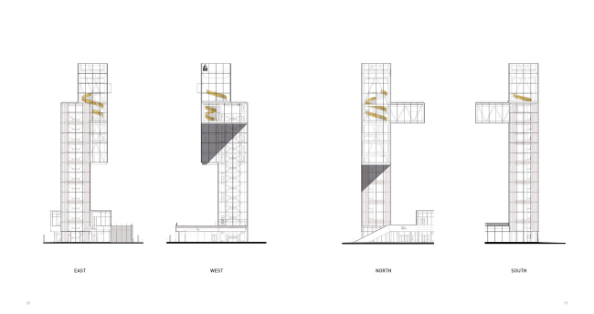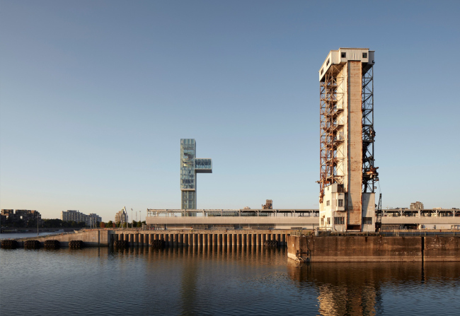 Башня высотой 65 м по своей форме напоминает и по структуре перекликается со старой конвейерной вышкой для разгрузки зерна, сохранившейся рядом. Добиться эффекта позволило прозрачное остекление, благодаря которому конструкции ясно читаются даже издали. На высоте 55 м находится просторное универсальное помещение, приспособленное для проведения мероприятий. По винтовой лестнице золотого цвета, которая также хорошо видна снаружи (по мысли архитекторов, это дань уважения закругленным внешним лестницам, характерным для застройки XIX века и одновременно символ пшеничного колоса, ведь зерно всегда было здесь основным товаром), можно подняться еще выше в нависающую над водой полностью стеклянную смотровую кабинку.