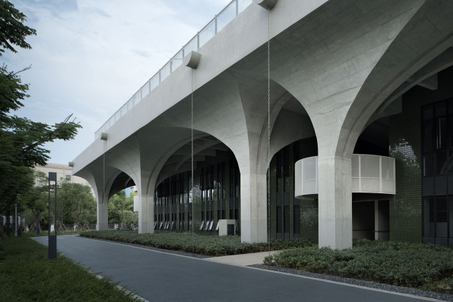 Так получился полуоткрытый первый этаж с эффектными бетонными арками и сводами, вторящими окружающим сооружение деревьям (на кровле они также высажены).