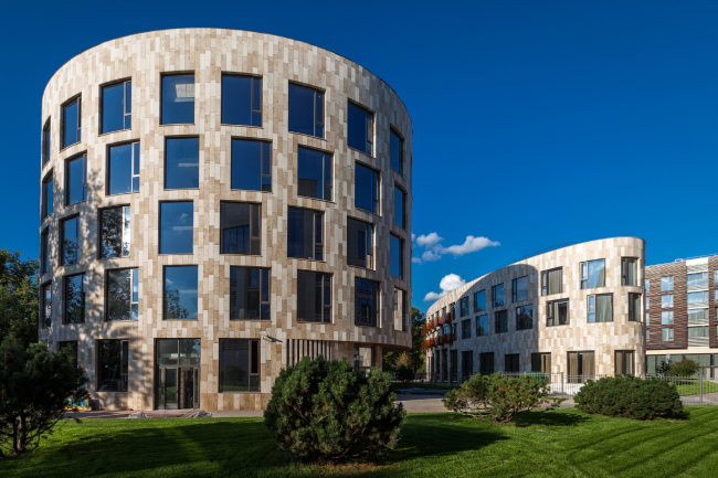 The new complex on the Lenigrad Highway recently finished by ADM architects makes great play with its border-line location between the highway and the green area by the Moskva River bank.