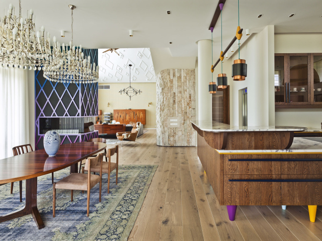 The furniture project of "Python" is the result of subtle and painstaking selection work. The furniture collection was selected not from the catalogues of the world-famous brands but from the galleries and antique shops of European capitals. Some pieces of furniture, for example, the L-shaped kitchen island or some of the lights were developed by Arseny Leonovich and the team of PANACOM specifically for this project.