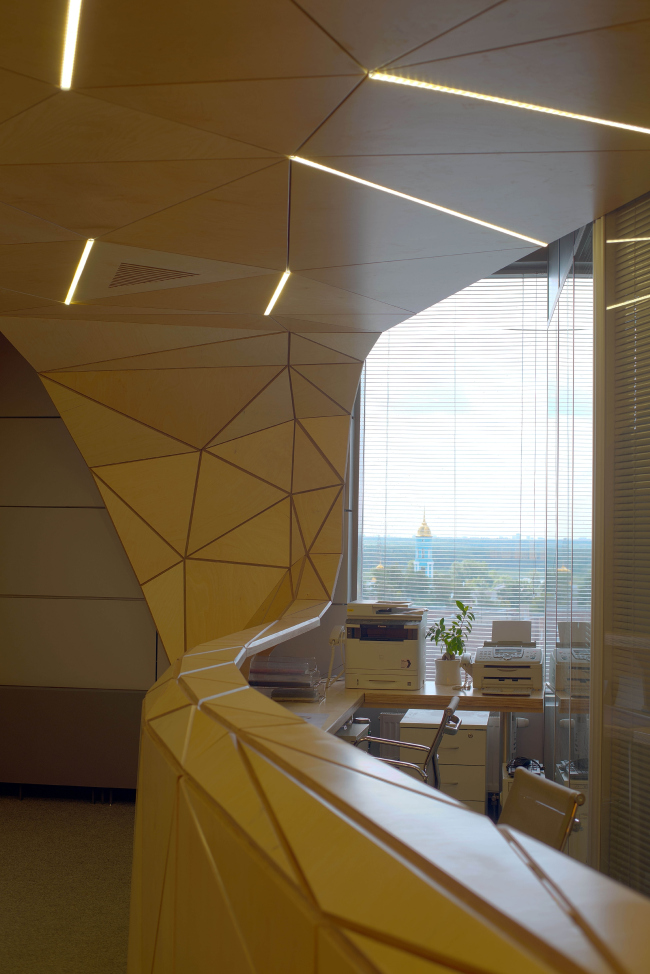 Entering the office, the visitors at once see the reception desk that looks like a moored boat. Its narrow up-tilted "bow" rests upon massive supports, while is board sides are finished with large panels. The flexible sculptural form is dissected into the planes of plywood panels with ostentatiously wide joints - they look like pencil or maybe computer lines of volume-building but the trick is that all of the elements are triangular, a triangle being the basic module, just the way it was the basic form-shaping element in another Kuzembaev project - the facade of "Five Planets" shopping mall. Docking the wall, the "boat" grows up in a semblance of a cracked tree trunk or even ivy: from this point on, the grid of the joints start looking like a geometric pattern of twigs and branches - the surface grows on, entwining in a broad canvas the entire ceiling, and, finally, getting to the opposite side of the miniature reception room, abruptly goes down, closing the side wall with a wooden screen - smooth and jointless but with the company's logo and a TV upon it.