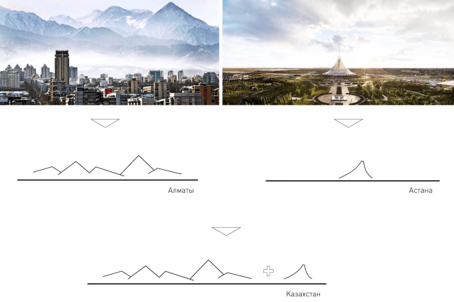 The construction site is located in a new district. It stretches along the yet-empty but actively developing street called "Novy Orynbor", not far away from the capital's airport - the regular rectangular site, not constrained by any surrounding buildings or any other restrictions. According to the authors, Dmitry Vasilyev and Alexander Popov, they immediately felt a desire to create here a memorable skyline that would not pass unnoticed in the cityscape. The architects are convinced that Astana is in a dire need of "mountains": while in Kazakhstan's former capital, the city of Amaty, the buildings stood out against the background of a majestic mountain panorama, the new capital cannot boast either a dramatic mountain skyline or even a hilly landscape - there is nothing but a boundless plain stretching as far as the eye can reach. Although the new business center gets more and more high-rises each year, they - due to their vertical proportions - form rather a "forest" that enhance the flatness of the land with their sheer height; in order to create a building that would really look important in this environment, the last thing you want to do is building yet another "tree trunk". What you need to do is use your architectural techniques to "cancel the horizontal". This is how the idea came about to build the new bank building in the form of a mountain range.