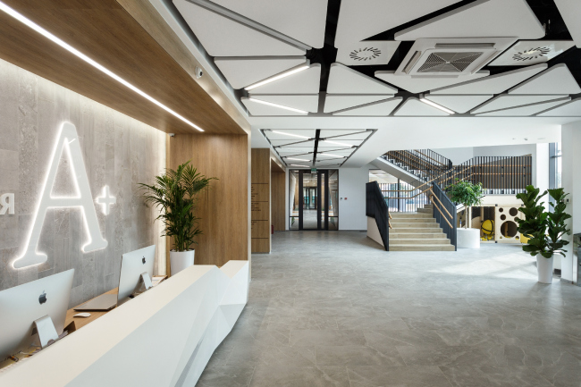 The gymnasium A+ opened its doors on the territory of the housing complex “Comfort Town”, also designed by Archimatika. This place also features yet another project designed by this firm: the complex of “Academy of Modern Education A+”, which consists of a kindergarten, a school of fine arts, and a junior high school. Gymnasium A+ will teach students from third to twelfth grade.