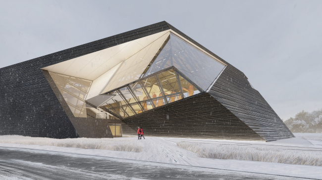 Indeed, the effect of a “stranger coming here by boat” is quite strong, even in spite of the fact that the building is firmly rooted in the ground – it is enough to take a look at its triangular “nose” pointed southward and looking like a cross between a modern submarine and an Ancient Greek triera. As for the elongated body of the building itself, it looks like a figure clad in some sort of hide, the likeness being enhanced by the black color and ribbed structure of the horizontal bands, upon which, as the architects are vividly demonstrating, snow will look great come winter.