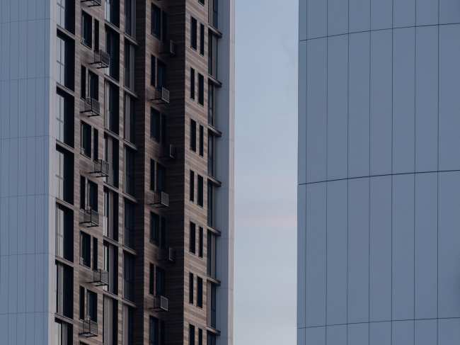 This difference is something that the entire plastique intrigue is based upon. North and south are faced by the white facades – they are a little bit longer, and, in addition, are extended by ledges that merge with the upper cornice link – this is how peculiar U-shaped “casings” appear that wrap around the volumes of the towers. forming a kind of a volumetric “frame”. The external surface of the white facades is slightly wavy, and they look particularly interesting in a slanted light that enhances the sculptural character of the curve.