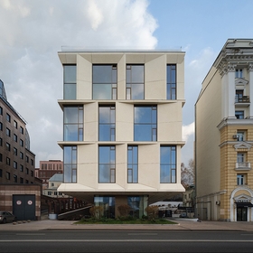 Строгий главный фасад с широким порталом оформляет большой витраж центральной входной группы, а плавные криволинейные витражи нижнего уровня повторяют пластику рельефа, что позволяет максимально интегрировать интерьер в окружающую среду и стереть границы между наружным и внутренним пространством.