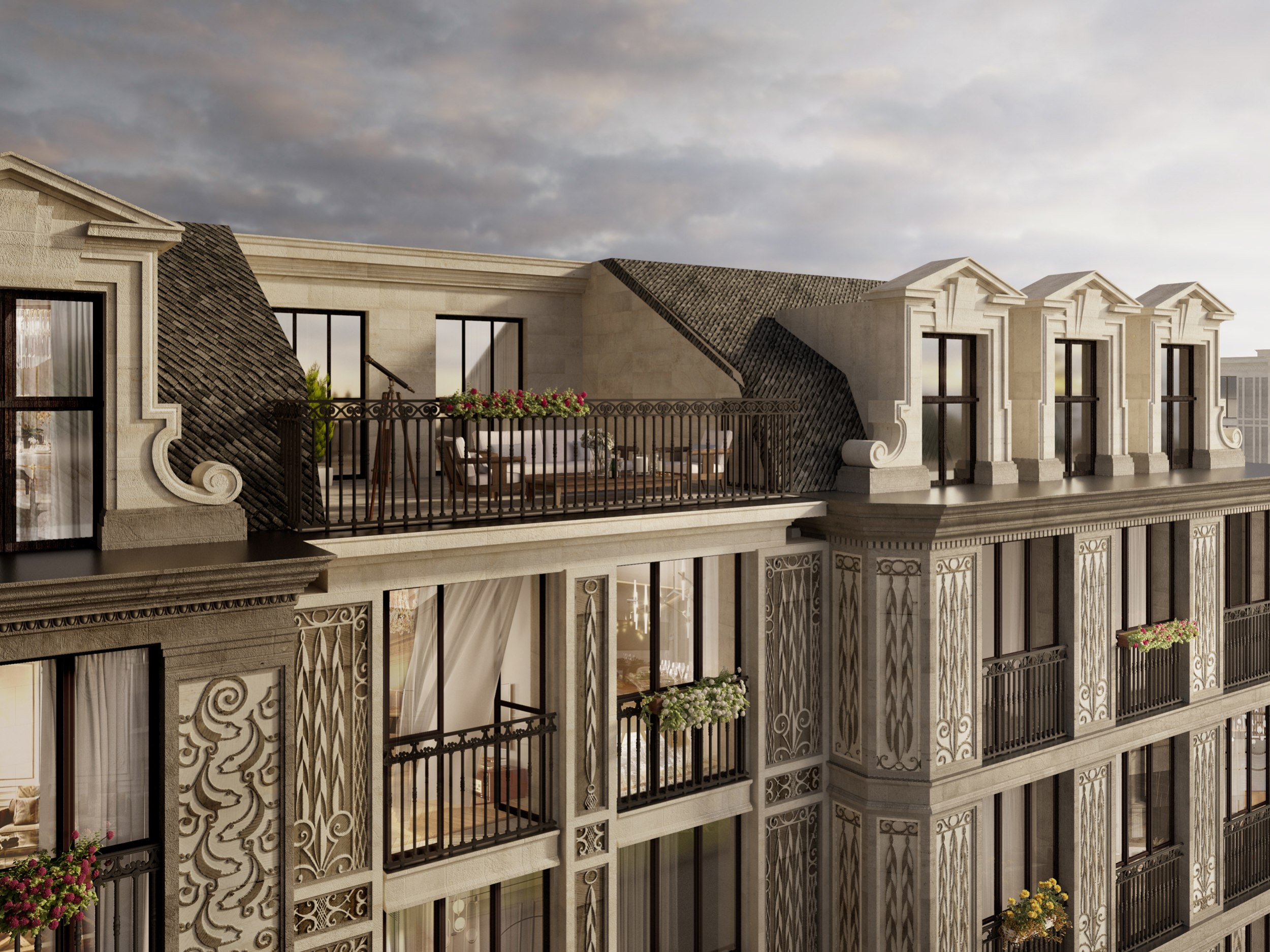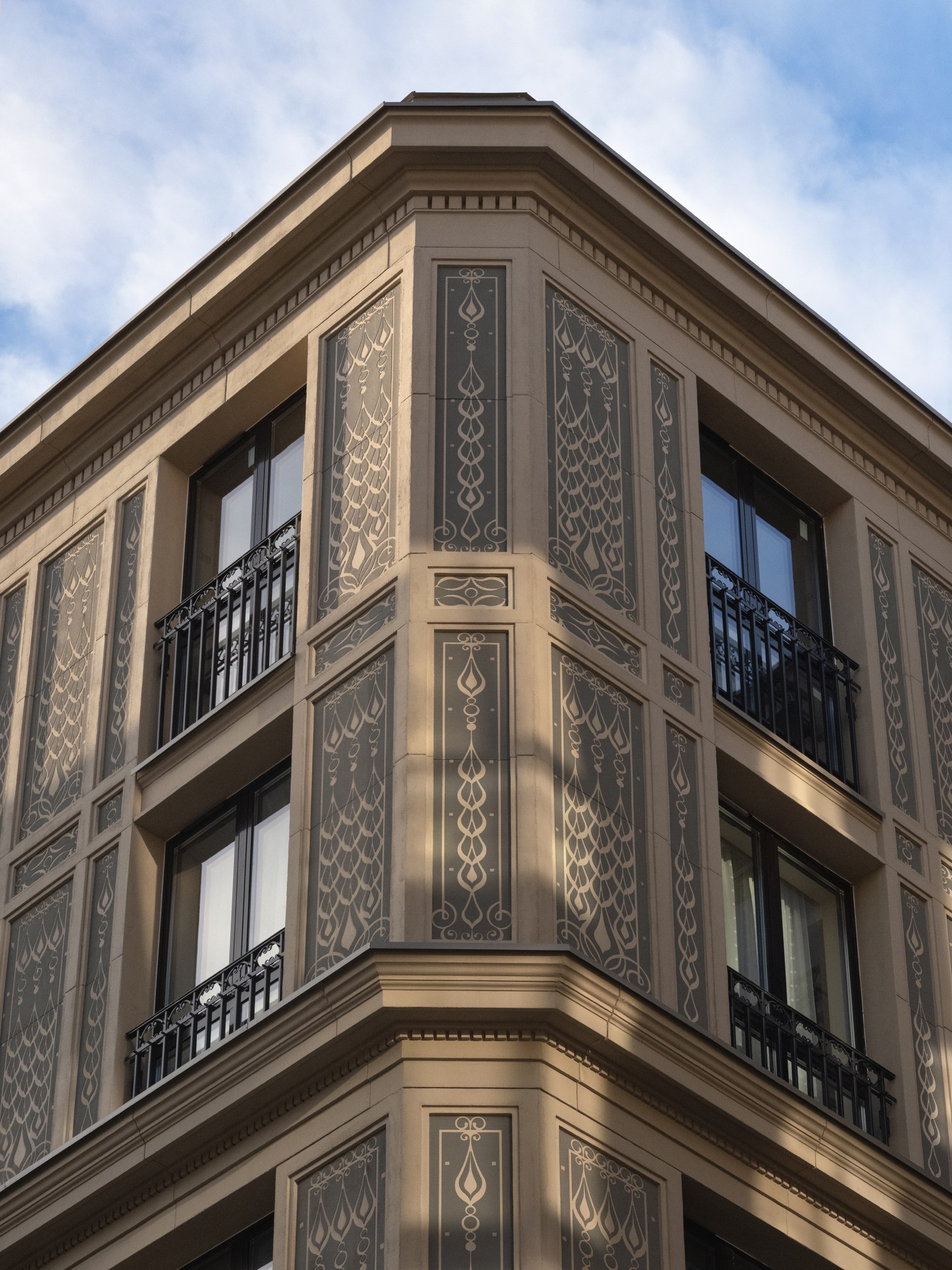Архитектура гостиницы менее прихотлива, композиция её фасада максимально увязана с пропорциями соседнего исторического здания, однако не повторяет его стилистику.