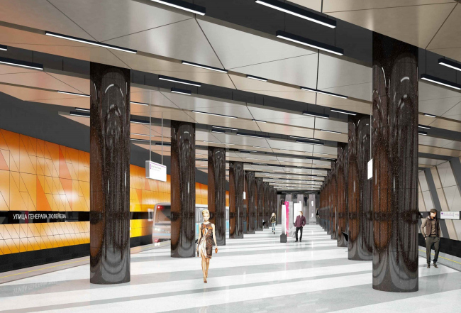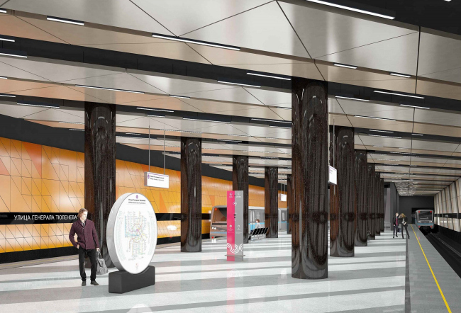 «Станцию метро «Улица Генерала Тюленева» украсит потолок из крупноформатных треугольных панелей, выполненных из алюминия, анодированного под титан. Путевые стены будут иметь схожий узор, при этом отличаться друг от друга по цвету – одну решено выполнить в оранжевом оттенке, другую – в тон потолка. По словам Сергея Собянина, это будет самая длинная линия метро, которая проходит не через центр города и идет до Троицка», - рассказал Сергей Кузнецов.