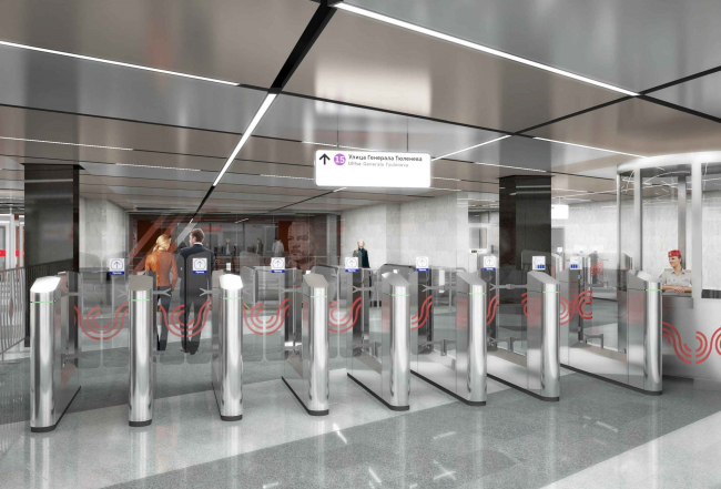 Стены и пол кассового зала решено отделать серым мрамором и агломератом оранжевого цвета. Одна из стен будет стеклянной – на ней разместится декоративное панно в честь И.В. Тюленева (его портрет), выполненное из перфорированного алюминиевого листа. Общая площадь станционного комплекса, включая наземные павильоны, составит около 13 тыс. кв.м. Проектировщик – АО «Моспромпроект». Ранее проект согласовала Москомархитектура.
