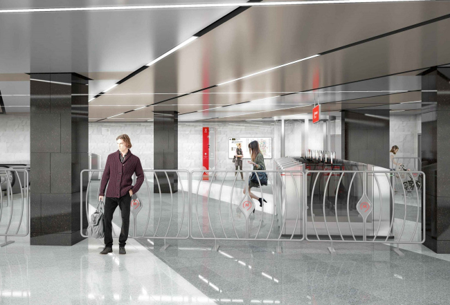 Современный дизайн станции придадут динамичные косые линии – их можно наблюдать как на потолке, так и на путевых стенах. В качестве основного материала будут использоваться алюминиевые панели высотой 1,2 метра, колонны украсит черный камень габбро-диабаз, а пол – серый гранит.