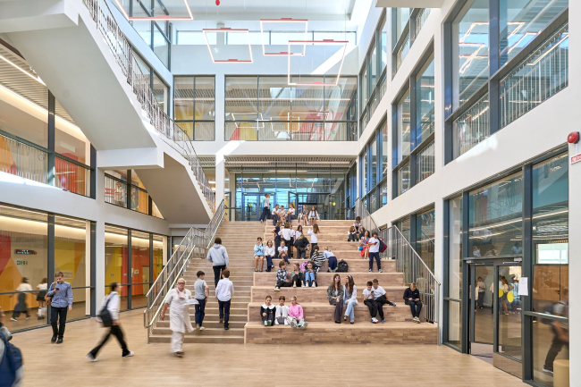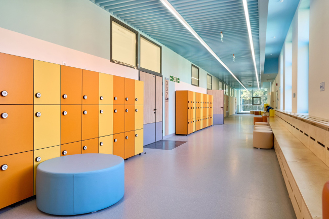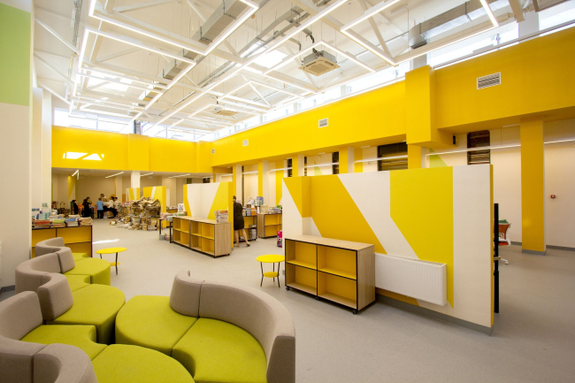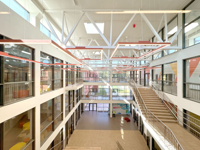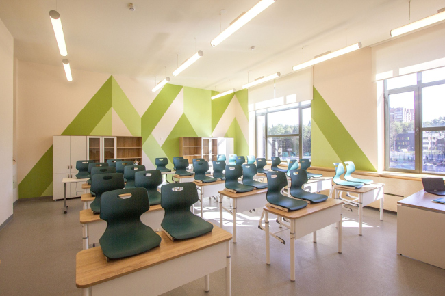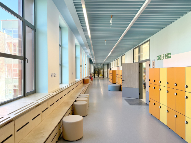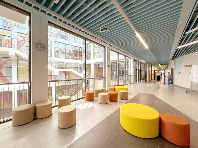 Главной темой интерьера является: «город для детей». Авторы выделили функциональные блоки школы и крупные объемы во внутреннем пространстве разными цветами и паттернами, создав таким образом ощущение, что ученик находится в огромном детском городском пространстве, построенном специально для него.