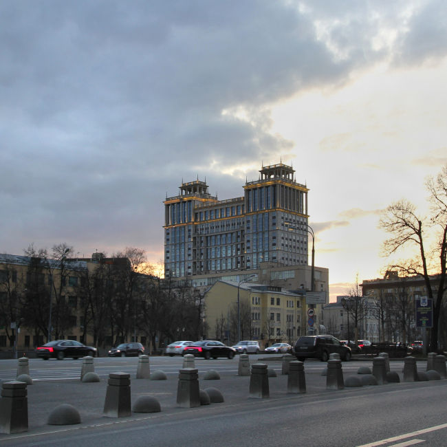 Внешний облик нового жилого комплекса представляет собой современное переосмысление «сталинской архитектуры», позволяющее дому гармонично вписаться в окружающую застройку. Заданная стилистика подчеркивается переменной этажностью здания (1-7-9-13-23 этажа) и богатым декором фасадов, украшенных многочисленными деталями: портики, балюстрады, колоннады и т.д. Планировка здания в форме каре позволила выделить необычайно просторный, закрытый от улицы внутренний двор, где будет устроена прогулочная парковая зона.