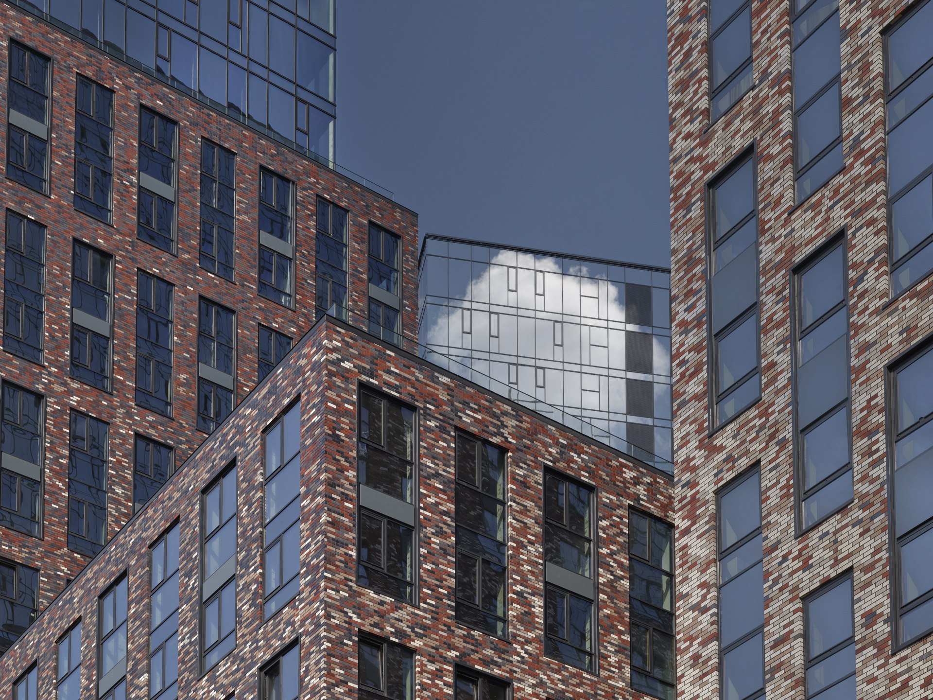 Визуально комплекс разделен на двухсоставные блоки: нижнюю часть выполнят в клинкерном кирпиче, в технике «градиент», причем оттенок кирпича будет становиться светлее ближе к земле. Верхняя часть – сплошное остекление с высоким коэффициентом отражения, что позволит корпусам буквально «раствориться» в небе. Объемы жилых корпусов сформируют внутренний двор с прогулочной зоной, где разместятся детские площадки и места для отдыха взрослых.