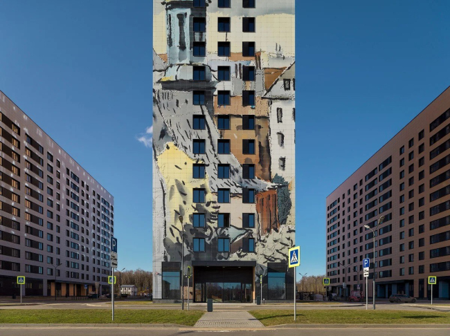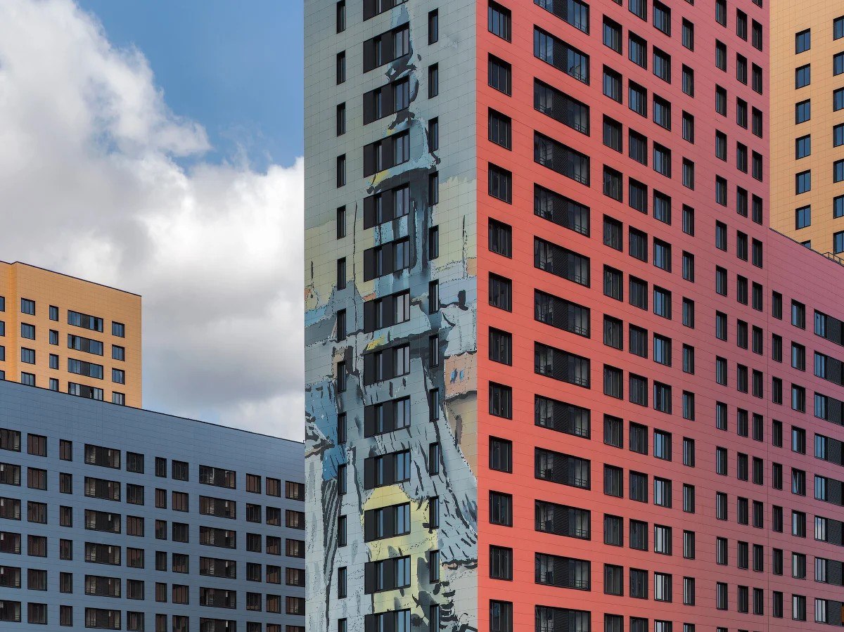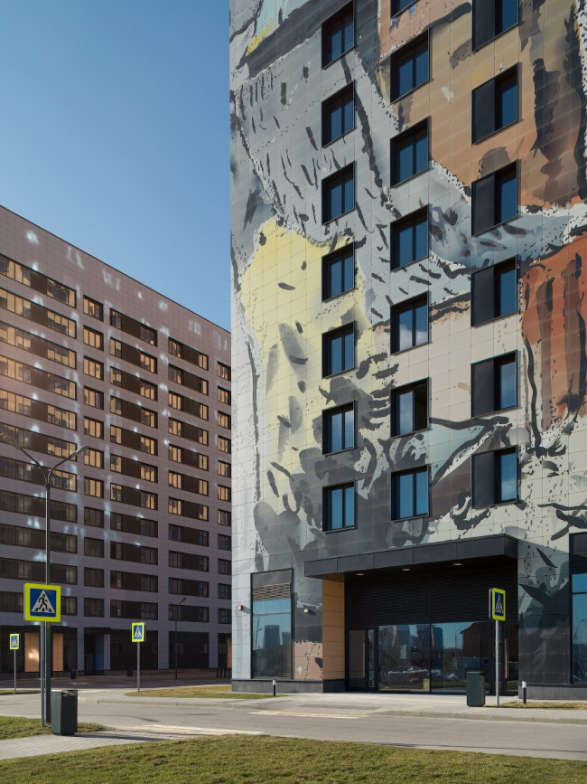 Жилой квартал «Филатов Луг» на территории Новой Москвы. В оформлении корпусов квартала «Филатов Луг» использованы акварельные картины, собранные из 18 тысяч персонализированных фасадных панелей