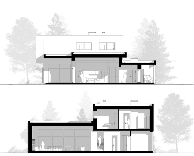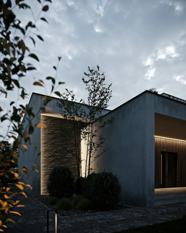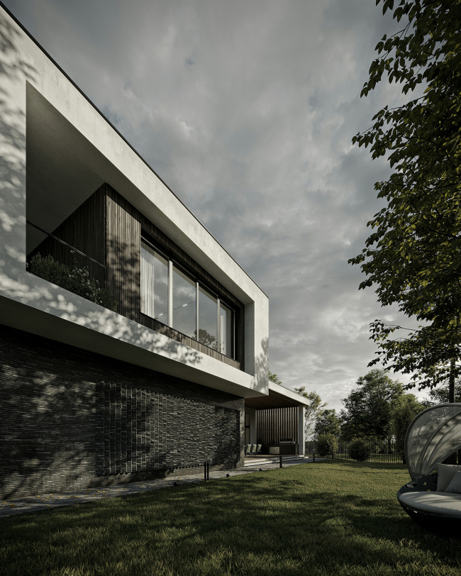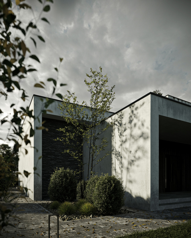 Основная идея проекта – согласовать архитектуру с природой, обособив ее от соседних участков. Для этого была выбрана двухэтажная конструкция, где первый этаж с трех сторон скрыт за живой изгородью, а со второго этажа открывается прекрасный панорамный вид. Кроме этого архитектурная композиция имеет L-образную форму, которая создает уединенный внутренний двор и размывает границы с садом.