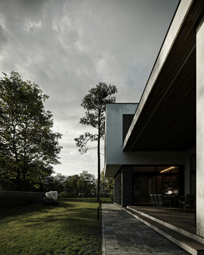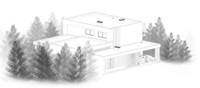 Главный фасад дома ориентирован на юго-восток, что позволяет наслаждаться рассветом. Ко двору примыкает открытый навес с летней кухней и террасой. Еще один навес расположился в тени деревьев и вмещает в себя два парковочных места.