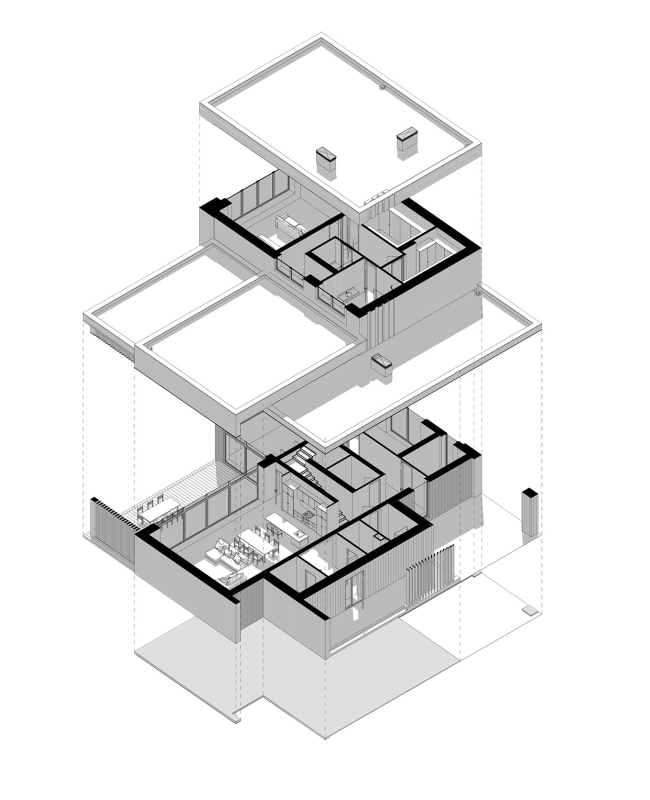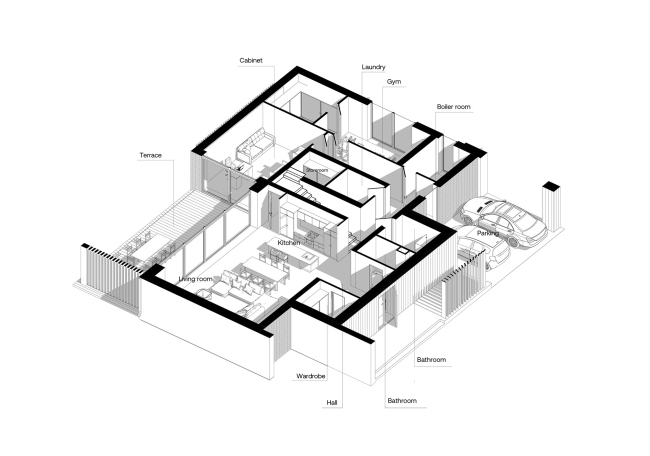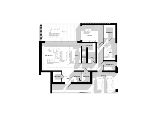 Первый этаж состоит из двух блоков. В основной части находятся гостиная, столовая и кухня, которые выходят во внутренний двор. Во втором блоке расположились вспомогательные помещения: кабинет, откуда можно попасть на задний двор, тренажерный зал и технические помещения.