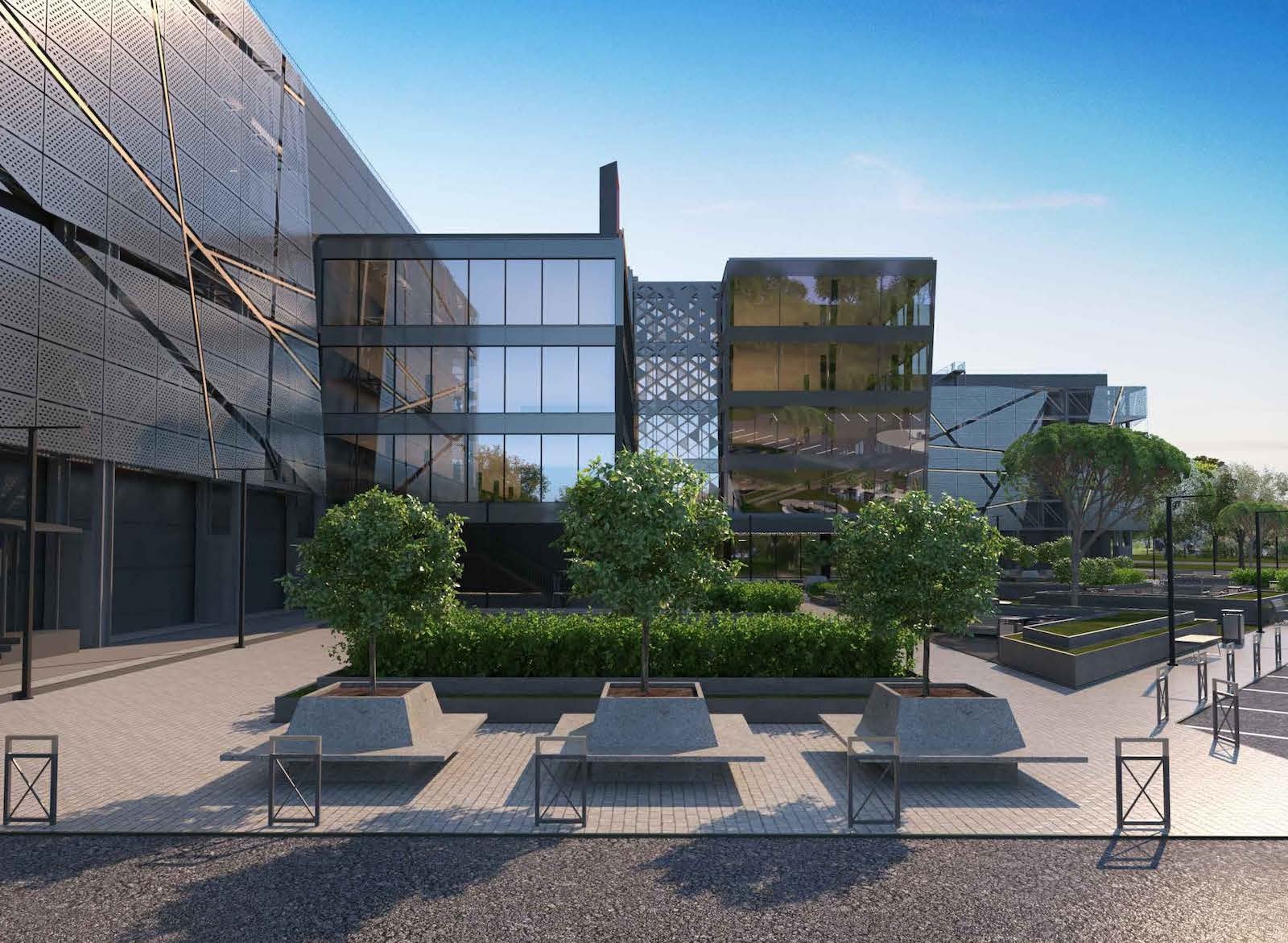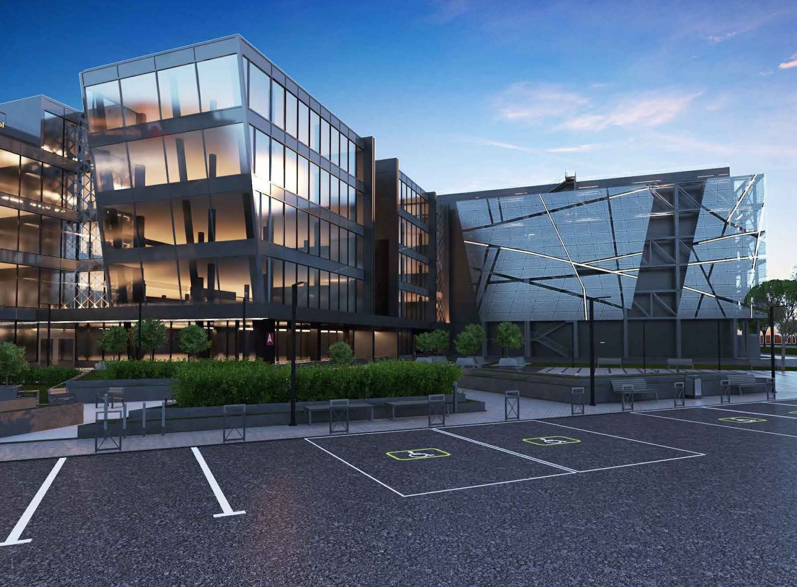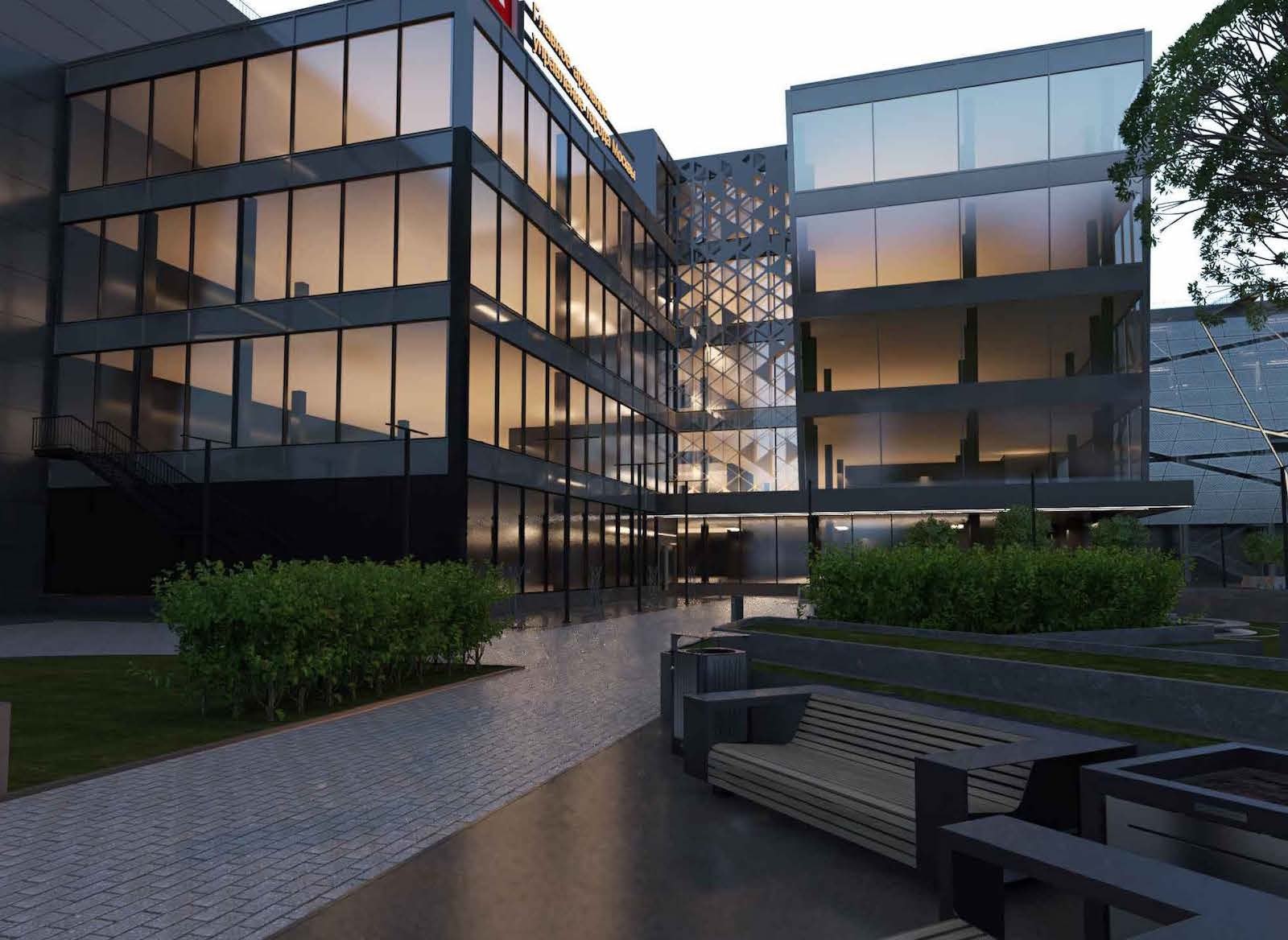 Вокруг комплекса сделают ландшафтное озеленение, в дизайне которого также будет прослеживаться образ треугольника, места отдыха и наземные парковки. Проектировщик – ООО «Стройконтинент».