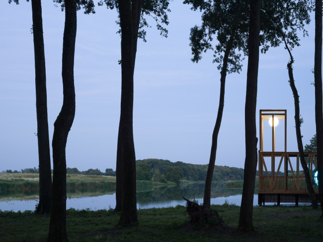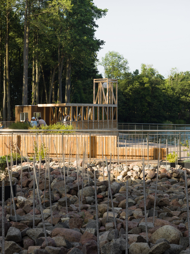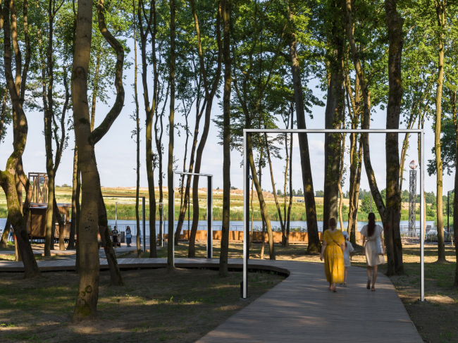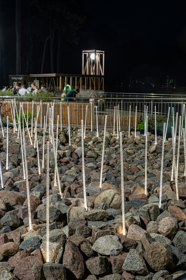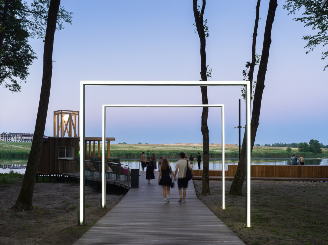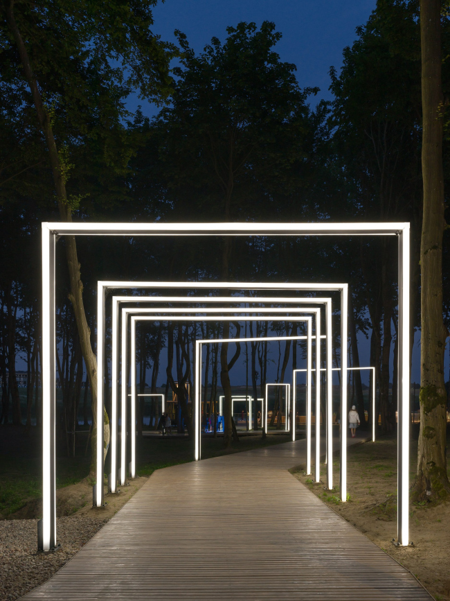 Свет играет определяющую роль в организации пространства парка. В мощеные дорожки вмонтированы разноцветные светящиеся плитки, словно указывающие дорогу. А над головой посетителей в темное время зажигаются белые окружности, напоминающие футуристические облака. Если последовательно проходить под световыми арками, которые как бы «простреливают» лес, можно попасть на набережную реки Гурьевки. Здесь расположена зона отдыха с деревянными лежаками, амфитеатр и поляна со светящимися «камышами», пройдя через которую попадаешь в ганзейскую сказку – к архитектурной доминанте пространства – «маяку», который излучает мягкий лунный свет.