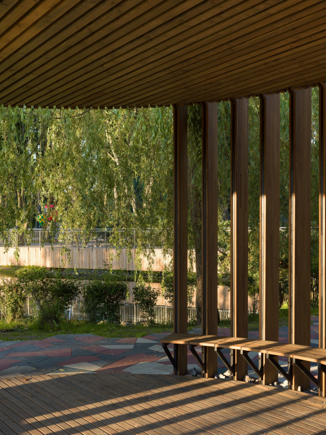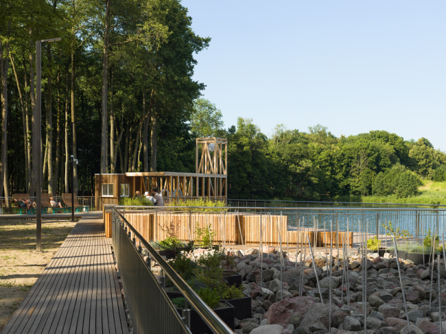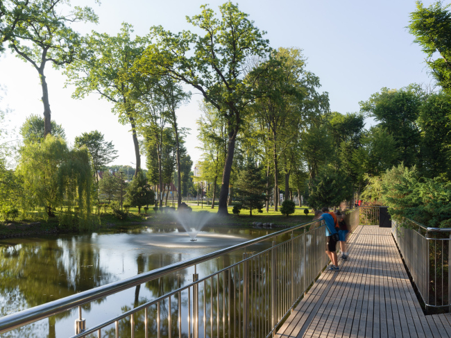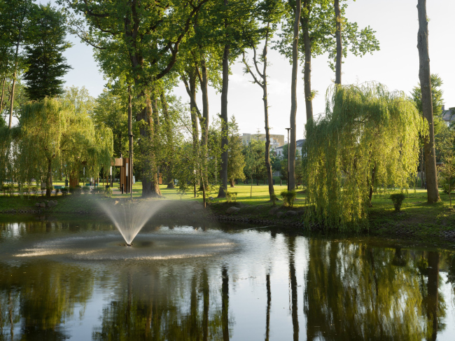 В западной части парка расположен небольшой пруд, вокруг которого организован деревянный променад для уединенных прогулок и компактные зоны отдыха у воды.
