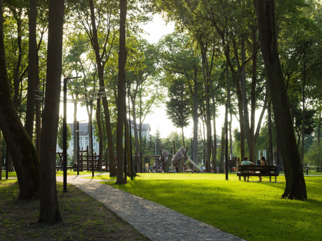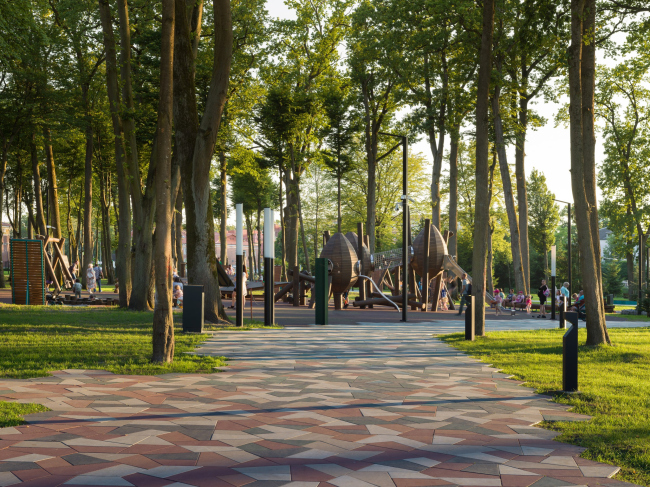 Через парк можно пройти прямым маршрутом в другой микрорайон города по благоустроенной природной территории. А можно прогуляться по нескольким уединенным тропинкам, вокруг которых разворачивается архитектурное действо, разнообразное по оформлению и насыщенности.