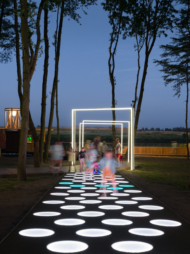 Входная зона парка встречает масштабными, яркими световыми инсталляциями, как бы продолжая бурлящую городскую среду. Таким образом пространство презентует себя, как место, где посетителей за каждым поворотом ждет очередное интерактивное чудо и незабываемые кадры на память.