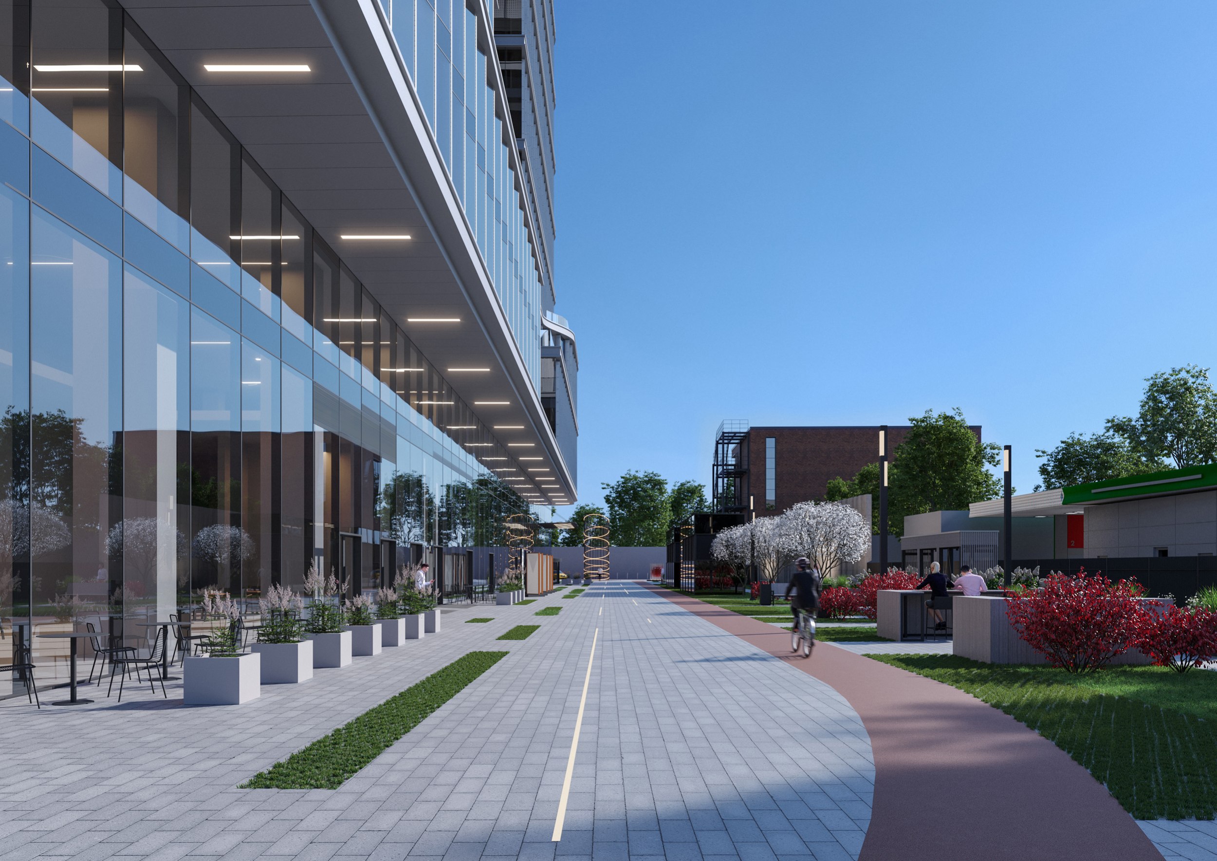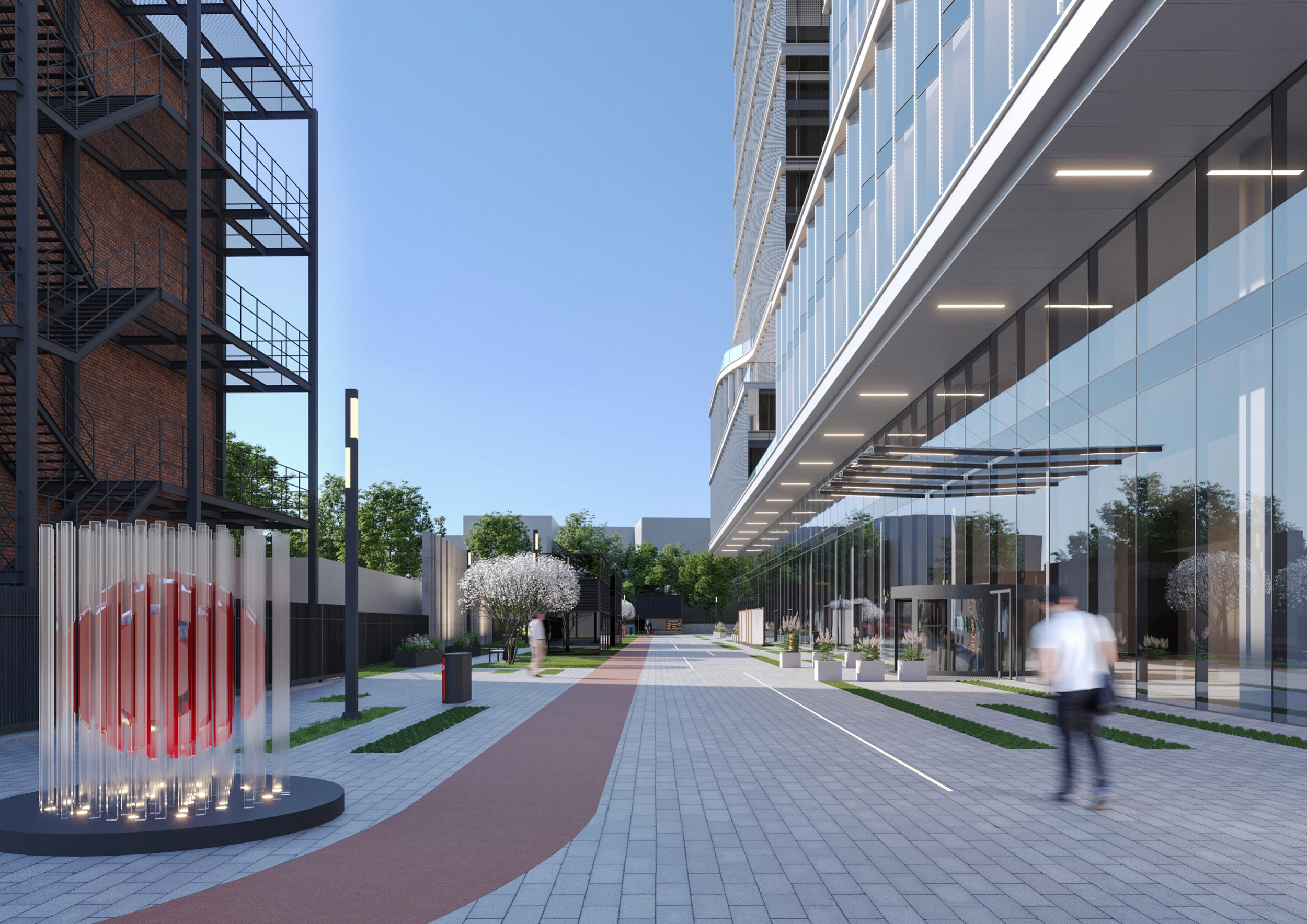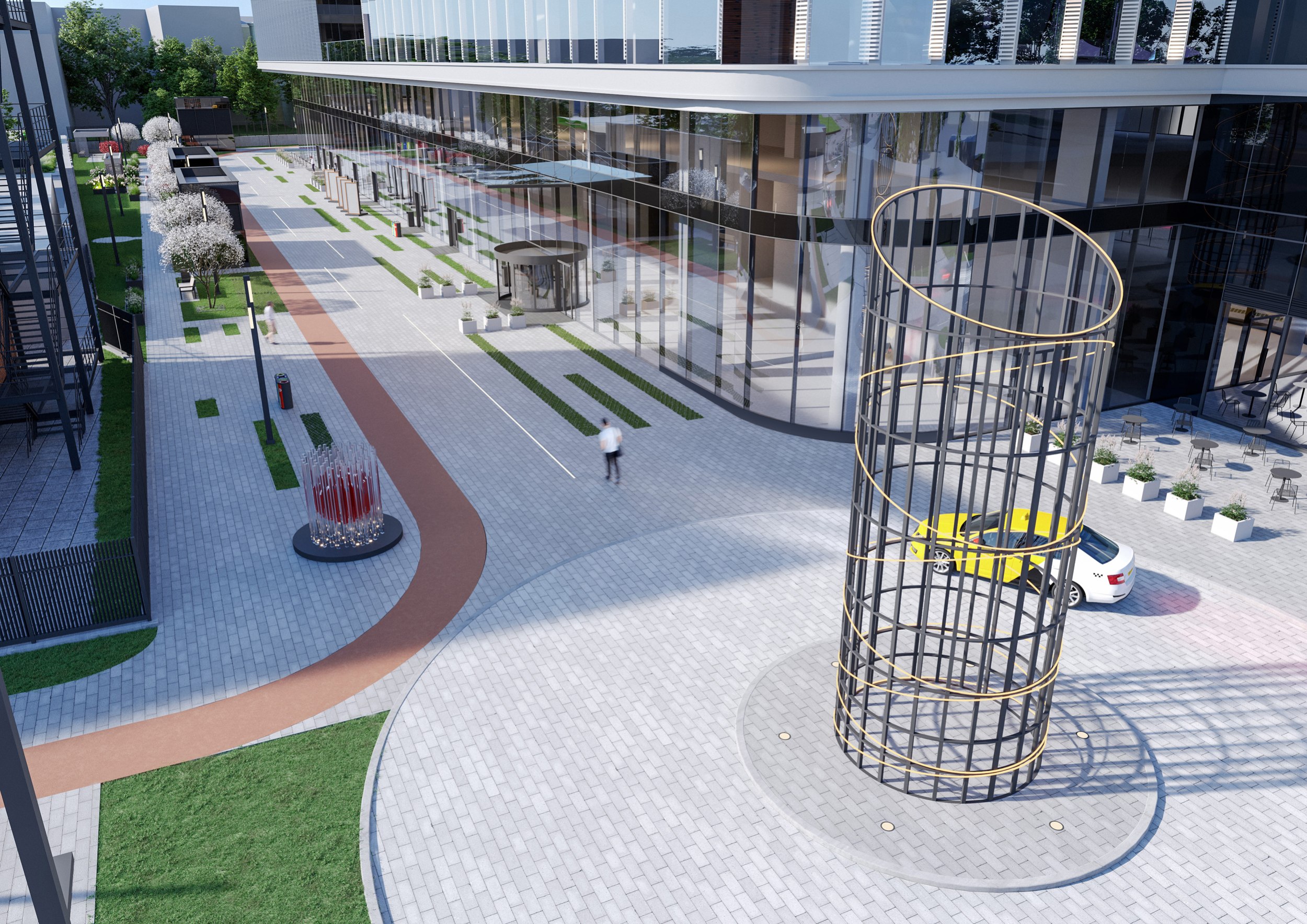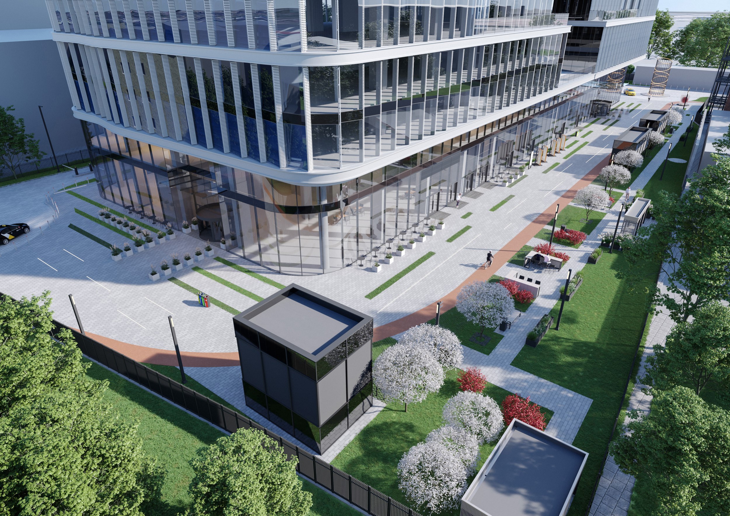 На территории бизнес-центра, доступной для всех желающих, будет создана комфортная безбарьерная среда. Появятся благоустроенные общественные зоны: газоны, пешеходные тротуары, летние веранды, парковки для самокатов и велосипедов.